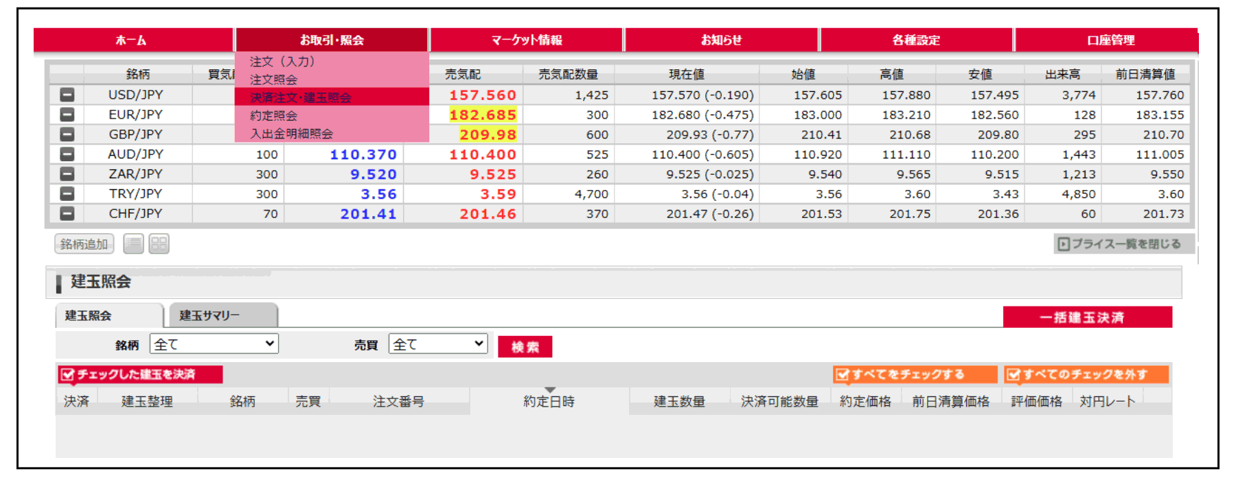 決済注文が発注されていない全ての建玉を一括で決済する注文方法です。なお決済対象の建玉のうち、両建てとなっている建玉に関しては建玉整理で決済され、それ以外は成行注文で決済されます。