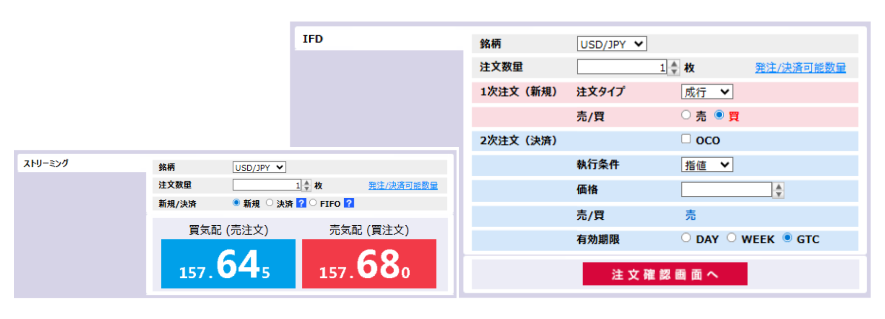 成行、指値、逆指値といった基本的な注文はもちろん、表示されるレートをクリックしてスピーディに発注を行えるストリーミング注文、指値と逆指値を同時に発注するOCO注文、新規と決済の注文を組み合わせたIF Done注文もご注文いただけますので、相場動向にあわせた機動的なトレードが可能です。
