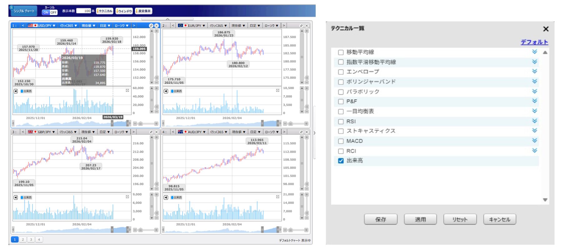 最大4分割でチャートを表示することができ、各種テクニカル指標にも対応しています。