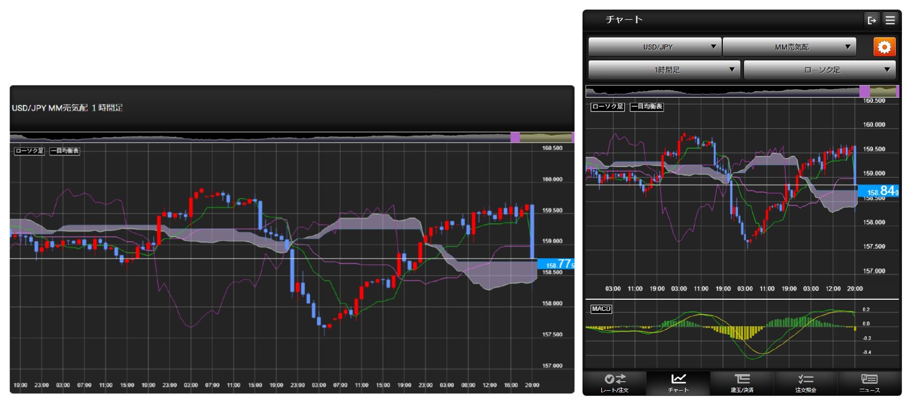 | 対応テクニカル指標 | 移動平均線、指数平滑移動平均線、ボリンジャーバンド、一目均衡表、エンベローブ、パラボリック、MACD、RSI、ストキャスティクス、RCI、モメンタム、移動平均乖離率、強弱レシオ、サイコロジカルライン |