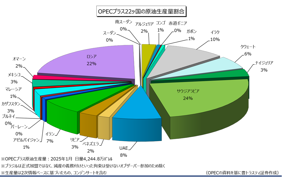「OPECプラス」は、原則として参加国全体が実施している日量200万バレルの協調減産と、有志国による自主減産(自主減産枠日量166万バレル、昨年12月時点で日量124万バレル))を行っております。