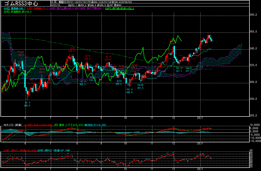 先週末のゴムRSS3(中心限月)は前週比4.5円高の352.1円で終了。6週連続で上昇しております。昨年12月26日に340円台を回復。非鉄相場や原油相場の上昇が続く中、ゴム相場も上値追いの展開となり、1月7日に昨年3月27日以来の350円台を回復。1月14日に360.2円まで上昇する場面も見られております。日経平均株価が年明けから上昇基調にあることも好感されているようです。
