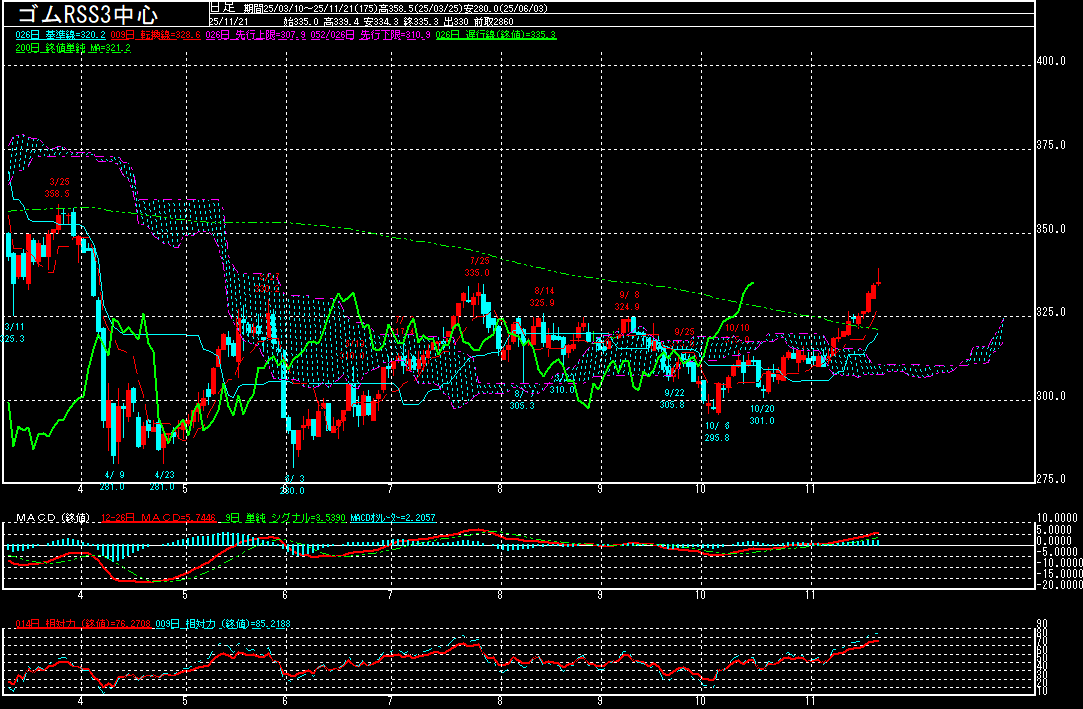 ゴムRSS3(中心限月)は、円安基調が続く中、11月7日から21日まで11営業日続伸中。10日に7月25日を起点としたダウン・トレンドや一目均衡表の雲を上抜いて「三役好転」となり、12日に9月9日以来の320円台を回復。翌13日に200日平均線を上抜きました。その後はじり高が続いたものの、19日に7月25日以来の330円台を回復。21日に339.4円まで上昇する場面もみられております。