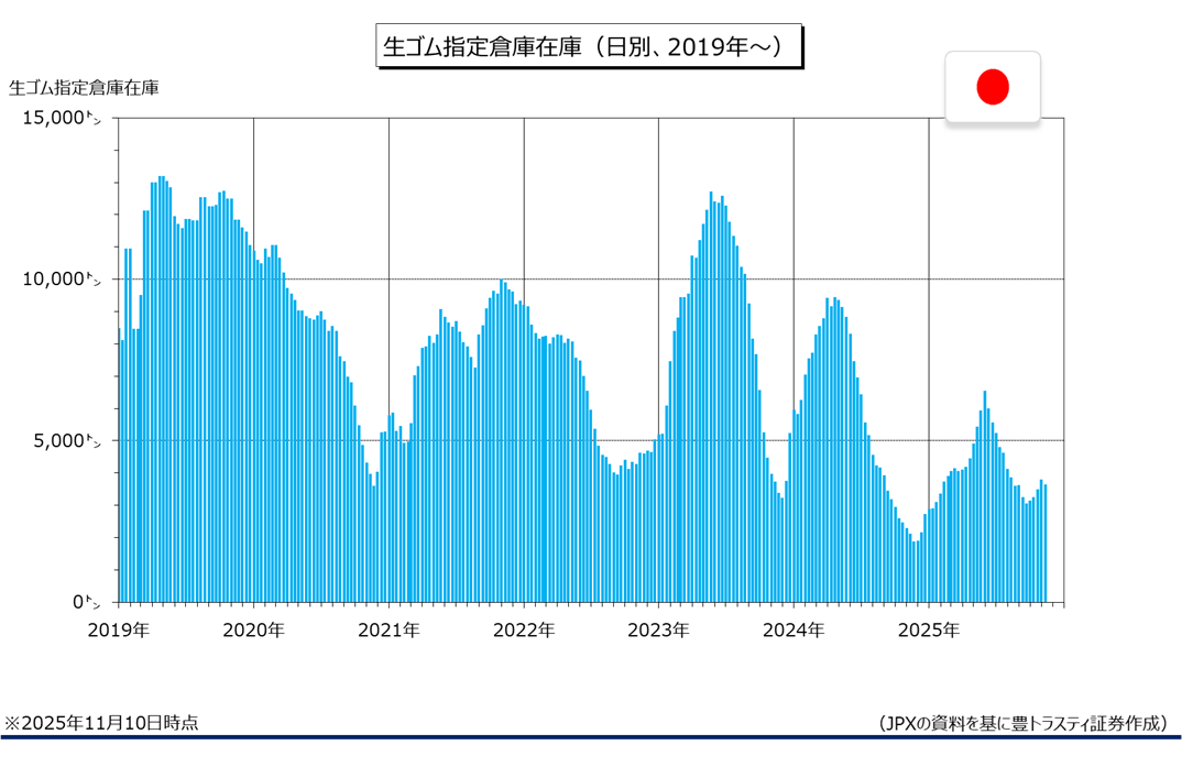 なお、JPXが集計した11月10日時点の生ゴム(RSS)市場指定倉庫在庫は3620トンで、10月31日時点(3755トン)に比べて135トン減少(入庫は289トン、出庫は424トン、前年同時期の在庫は2093トン)。5旬ぶりに減少に転じております。