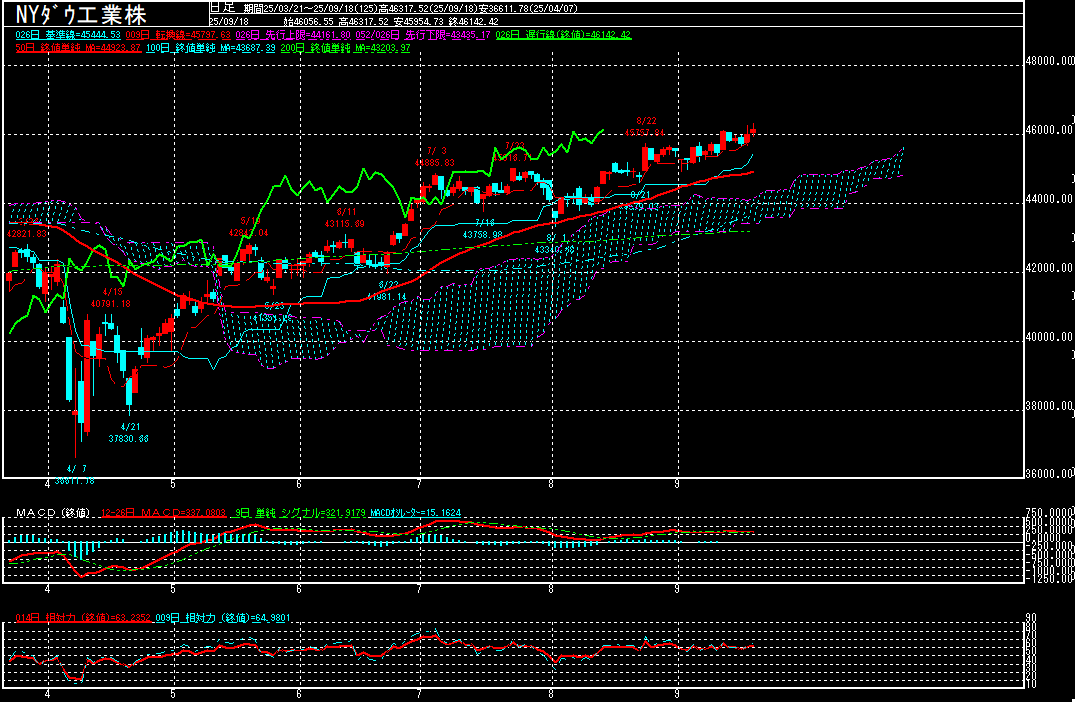 昨晩のダウ工業株30種平均は、前営業日比124.10ドル高の46142.42ドルで終了。