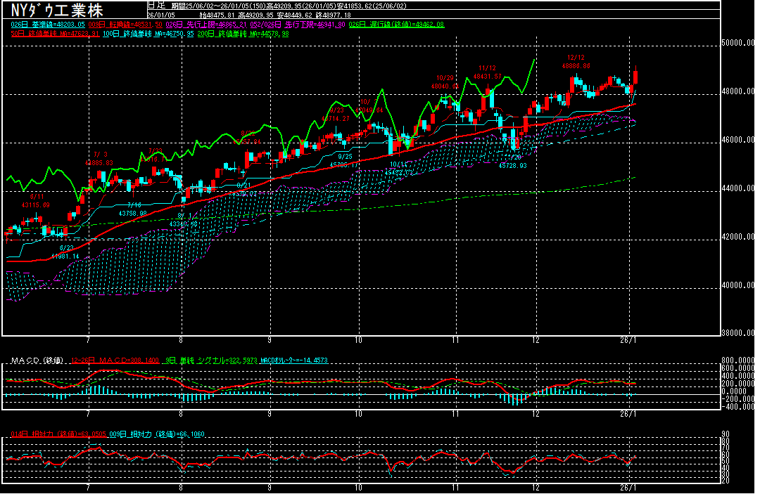 昨晩のダウ工業株30種平均は、前営業日比594.79ドル高の48977.18ドルで終了。トランプ米政権の南米ベネズエラ攻撃を受けて、石油関連株や防衛関連株を中心に買い進められ、昨年12月12日の高値48886.86ドルを上抜いて、一時49209.95ドルまで上昇するなど約2週間ぶりに最高値を更新。初めて49000ドル台に乗せております。
