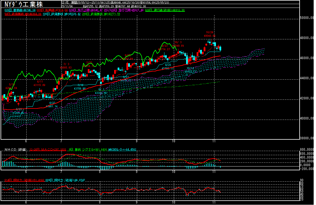 10月ADP全米雇用報告で、非農業部門雇用者数が前月比4.2万人増と3ヶ月ぶりにプラスに転じた一方、翌6日に米調査会社チャレンジャー・グレイ・アンド・クリスマスが発表した10月の米国内の人員削減数が10月としては2003年以来の高水準。米雇用情勢の減速を示す統計を受けて、11月6日に一時46787.44ドルまで下げる場面もみられるなど、10月23日以来10営業日ぶりに47000ドルを割り込んでおります。