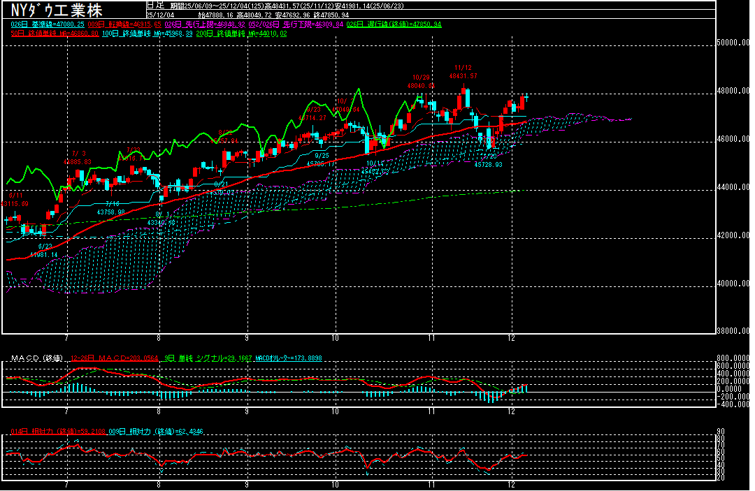 年末にかけて株価が上昇する「サンタラリー」への期待が高まる中、テクニカル的にもMACDは上昇基調が続いているだけに、目先は終値ベースでは11月12日以来の48000ドル台を回復出来るか注目されます。