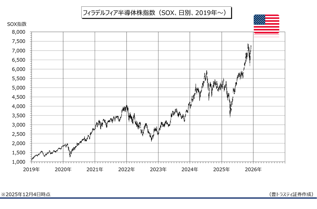 昨晩のダウ工業株30種平均は、前営業日比31.96ドル安の4万7850.94ドルで終了。11月20日に45728.93ドルまで下げる場面も見られたものの、100日平均線でサポートされる中で反発。FRB高官からハト派な発言が相次ぎ、FRBの追加利下げ観測が再度強まる中、11月21日から28日まで5営業日続伸。その後は、急ピッチな上昇に対する警戒感から上昇が一服するも、感謝祭を皮切りに始まった年末商戦の滑り出しが比較的好調だったことや、FRBによる追加利下げ期待が相場を下支えする中、底堅い地合いが続いております。