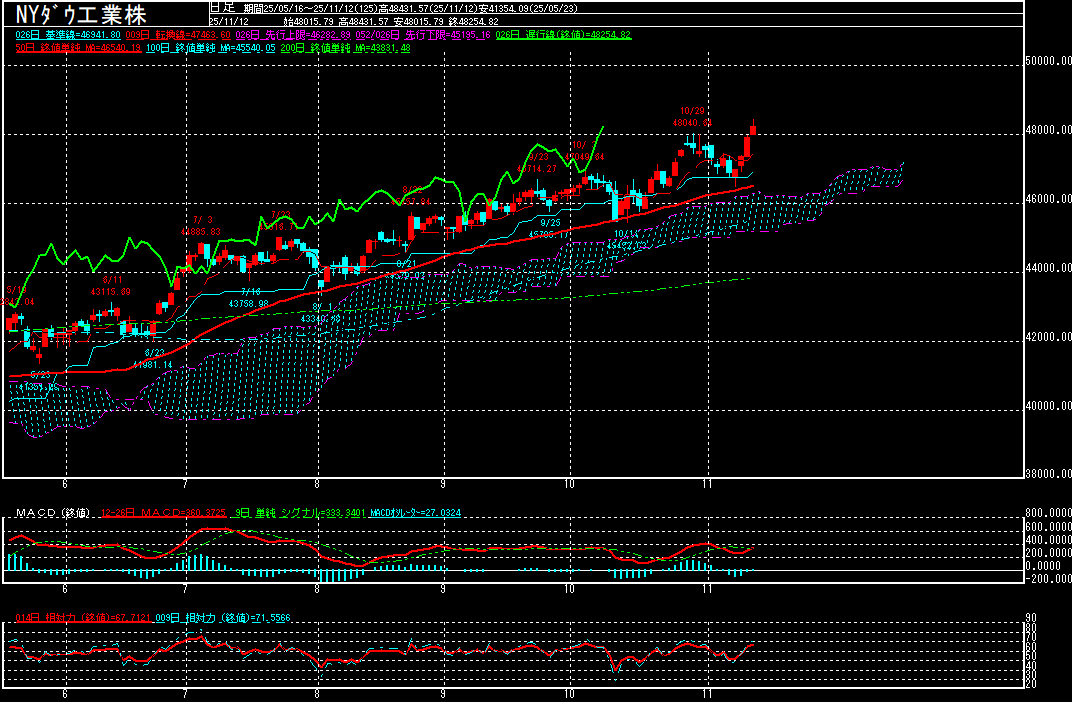 昨晩のダウ工業株30種平均は、前営業日比326.86ドル高の48254.82ドルで終了。米政府機関の一部閉鎖の収束が確実視される中、景気下押しリスクへの警戒感が和らぎ、4営業日続伸。終値で初めて48000ドル台に乗せております。10月29日の高値48040.64ドルを上抜き、一時48431.57ドルまで上昇し、最高値を更新しております。