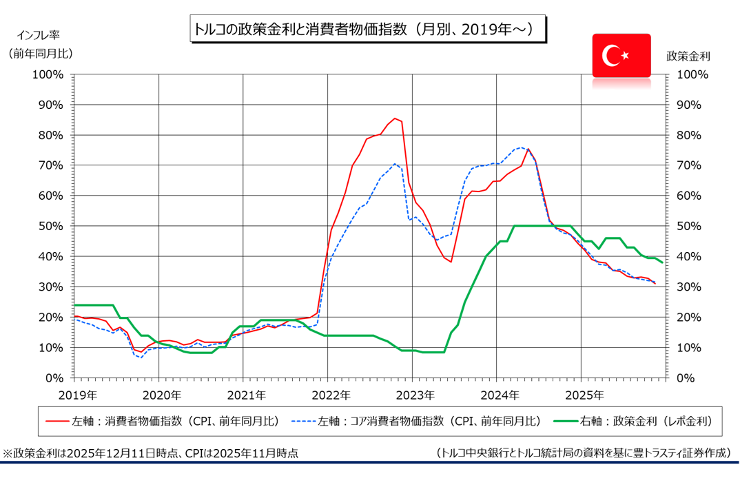 トルコ中央銀行(TCMB)は12月11日に金融政策決定会合を開催し、主要政策金利の一週間物レポ金利を1.50%引き下げて、年38.00%にすることを決定しました。利下げは7月、9月、10月会合に続いて4会合連続。下げ幅は前回(1.00%)から拡大しております。