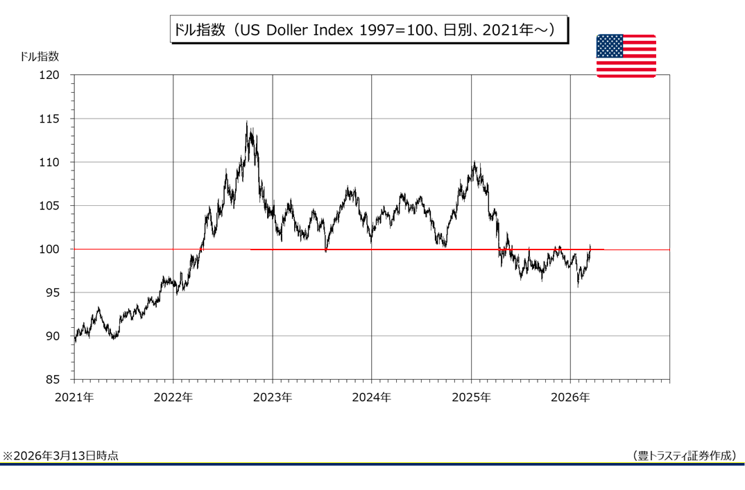 ドルの総合的な強さを示すドル指数は、節目の100を昨年11月24日以来4ヶ月ぶりに回復しております。中東情勢の緊迫化を受けて、基軸通貨であり流動性の高いドルに「有事の買い」が集まっております。