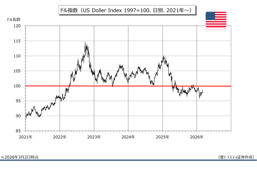 ドル指数は3月2日に、一時98.75まで上昇するなど、1月22日以来の98台を回復しております。米国とイスラエルが2月28日に、イランへの攻撃を開始したことを受けて「有事のドル買い」の動きが強まっているようです。