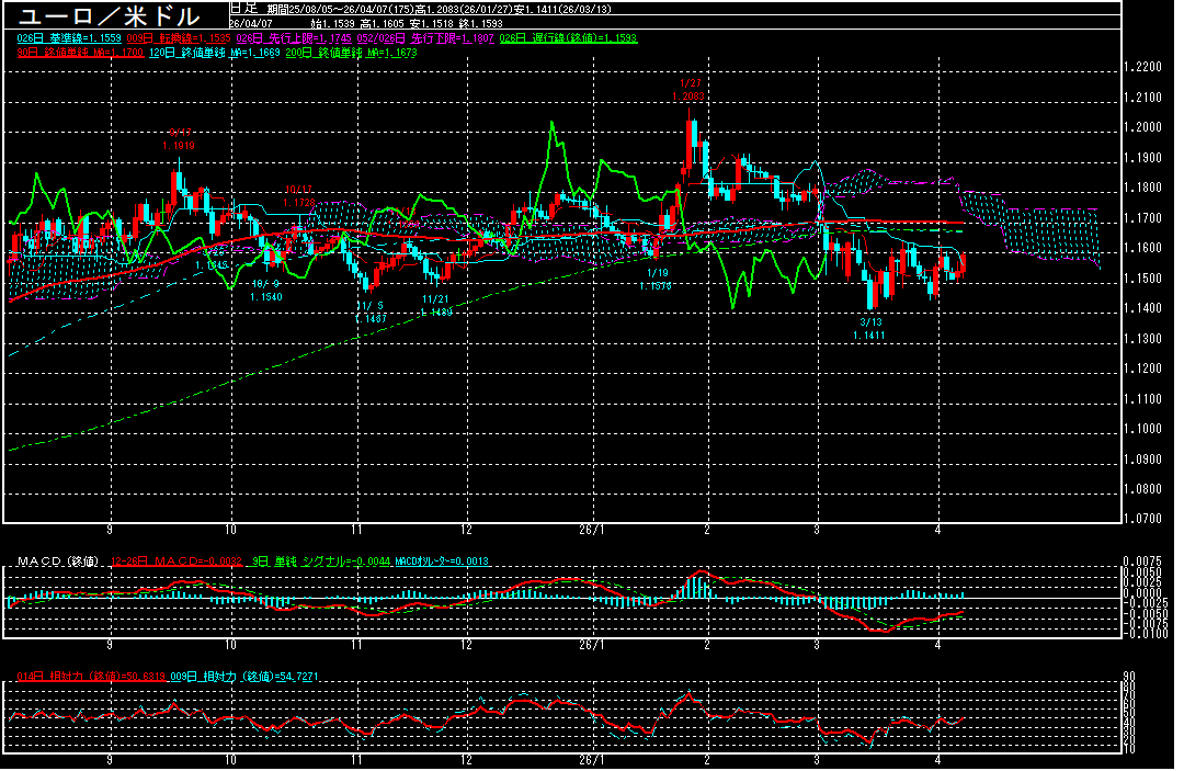 ユーロ・ドルは続伸。トランプ米大統領が設定したイランとの交渉期限が迫る中、パキスタンが米国に交渉期限の延長を求めたとの報道を受けて停戦期待が拡がったため、ユーロが買い戻されたようです。また、ベルギー中央銀行総裁が、イラン紛争が長期化すれば利上げを余儀なくされる可能性があり、早ければ4月の定例理事会で利上げを決定する可能性は排除出来ないと述べたことから、欧州中銀(ECB)の早期利上げ観測が浮上したことも、ユーロ買いを誘った模様。