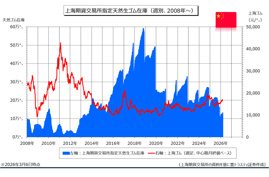 先週の上海ゴム(中心限月)は、前週末比600元安の16555元で終了。上海期貨交易所(SHFE)の天然ゴム在庫は3月6日時点で前週末比6800トン増の13万1780トンと、2週連続で増加しております。