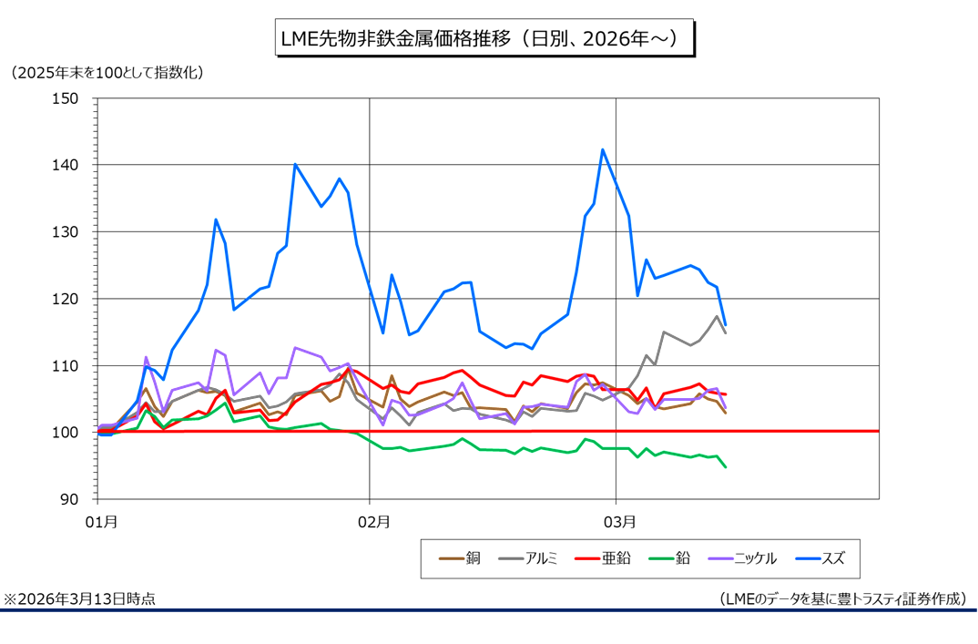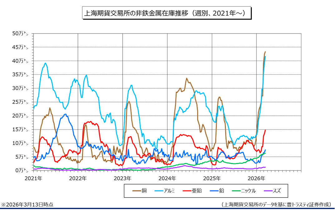 上海期貨交易所(SHFE)指定の非鉄金属在庫(3月13日時点)を見てみると、春節(旧正月)で休場だった2月20日の週を挟んで、銅は13週連続で増加。アルミは12週連続で増加しております。また、亜鉛は5週連続、鉛は6週連続、ニッケルは10週連続で、それぞれ増加しております。スズも増加に転じました。