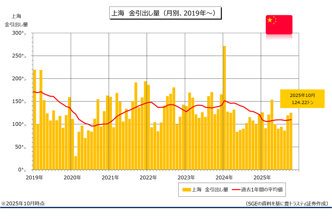 SGE(Shanghai Gold Exchange :上海黄金交易所)によると、10月の金引出し量は124.22トンと、前年同月比15.7%増加。前月(118.37トン)を上回り、4月(153.05トン)以来の高水準となっております。2025年1-10月期累計では前年同期比11.0%減少の1098.84トン。