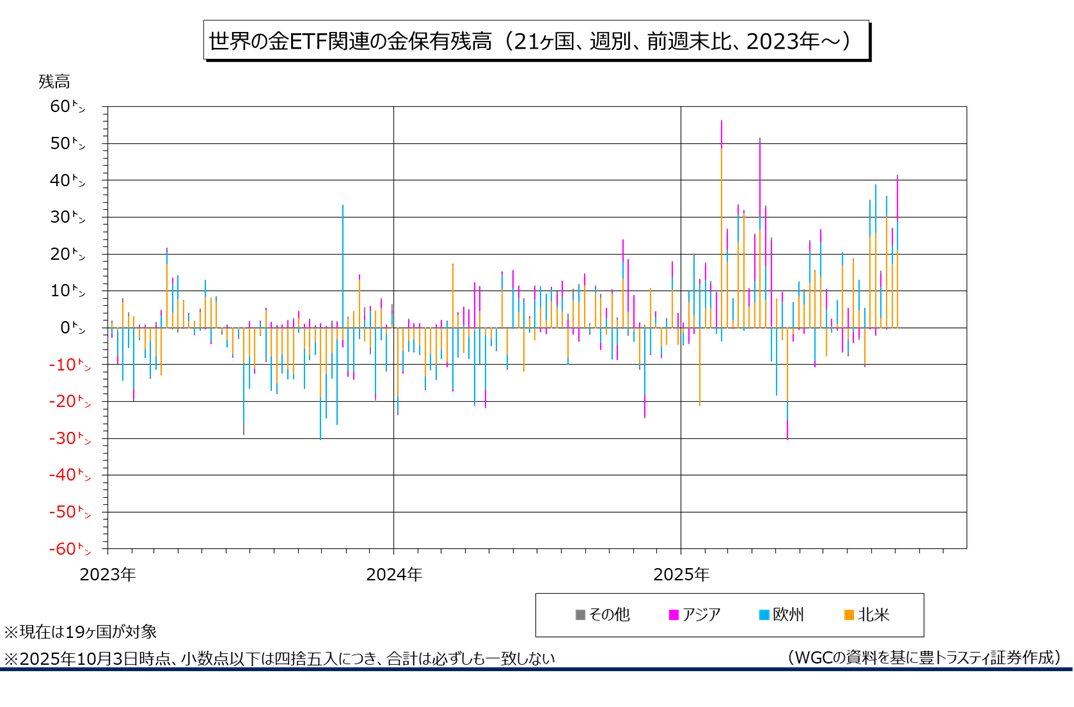 産金業界団体ワールド・ゴールド・カウンシル(WGC)のデータによると、10月3日時点で世界の金ETF(上場投資信託)関連(21ヶ国、現在は19ヶ国)の金保有残高は前週末比41.50トン増加の3839.30トンと、6週連続で増加となりました。