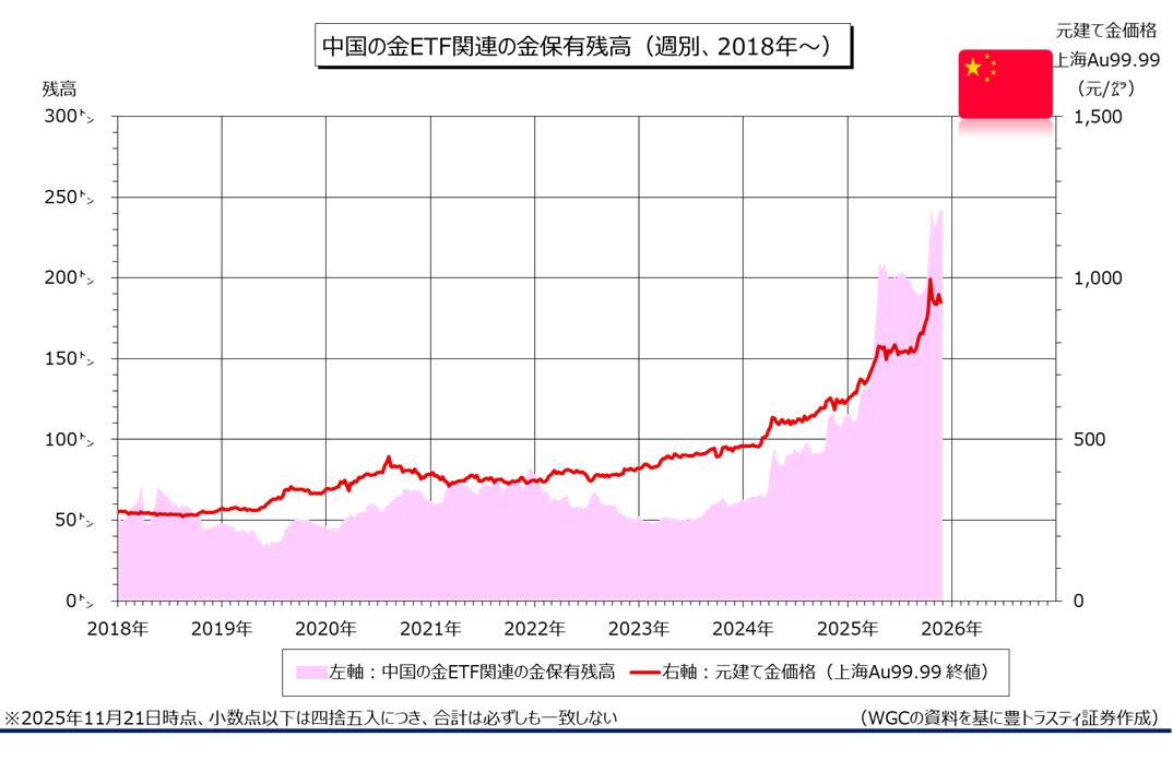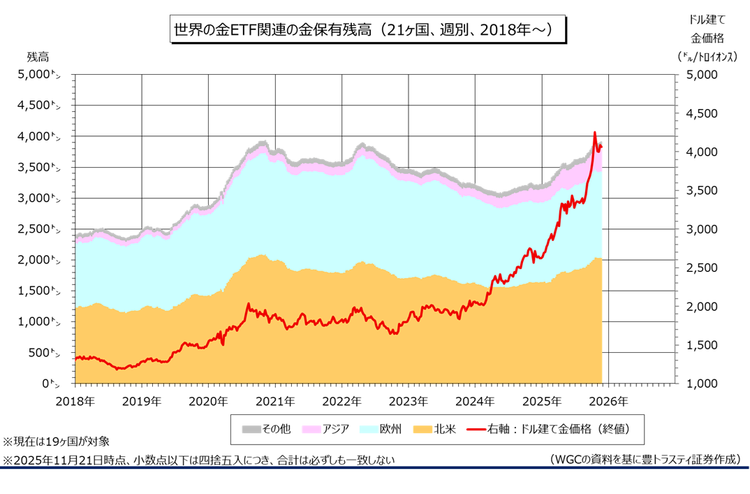 産金業界団体ワールド・ゴールド・カウンシル(WGC)のデータによると、11月21日時点で世界の金ETF(上場投資信託)関連(21ヶ国、現在は19ヶ国)の金保有残高は前週末比3.30トン増加の3906.20トンと、3週連続で増加しております。