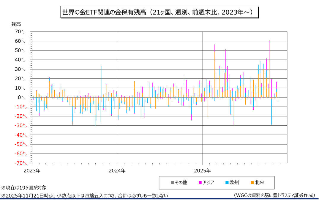世界の金ETF関連の金保有残高(週別、前週末比)