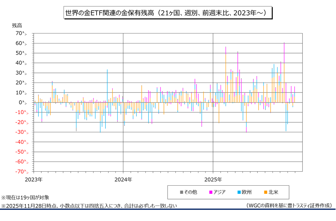 産金業界団体ワールド・ゴールド・カウンシル(WGC)のデータによると、11月28日時点で世界の金ETF(上場投資信託)関連(21ヶ国、現在は19ヶ国)の金保有残高は前週末比15.90トン増加の3922.10トンと、4週連続で増加となりました。