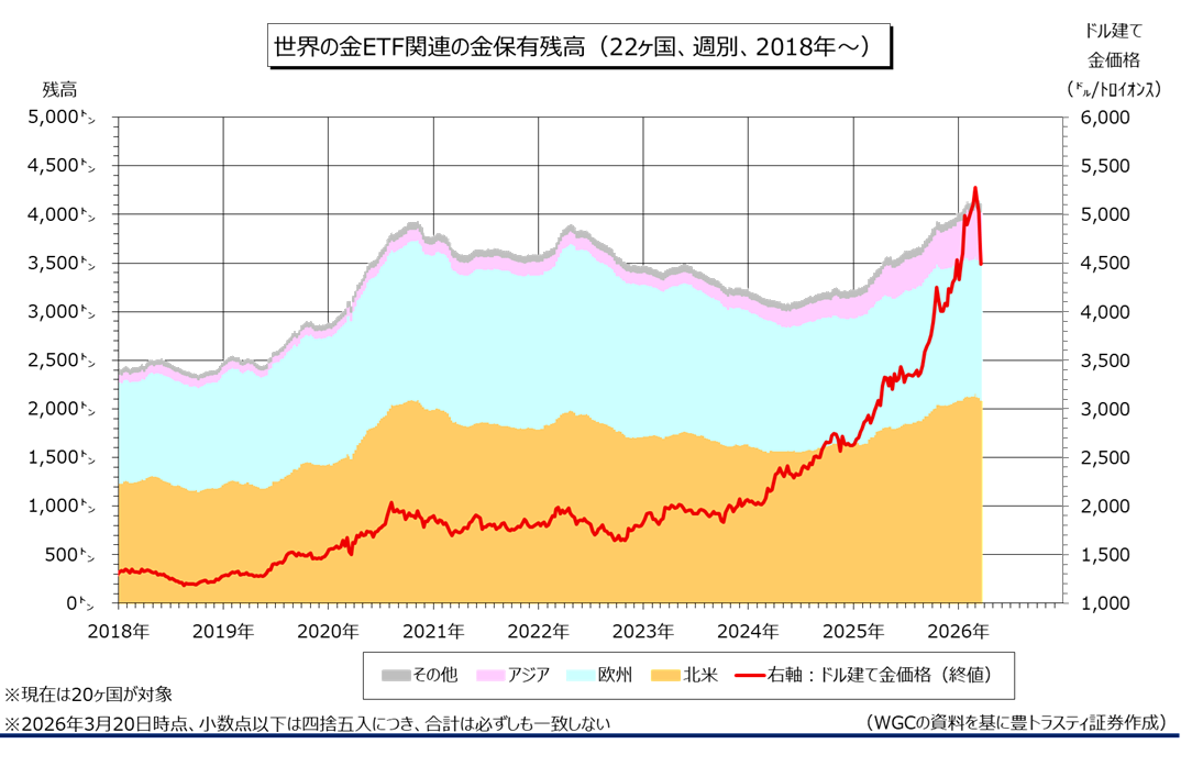 産金業界団体ワールド・ゴールド・カウンシル(WGC)のデータによると、3月20日時点で世界の金ETF(上場投資信託)関連(22ヶ国、現在は20ヶ国)の金保有残高は前週末比29.20トン減少の4106.50トンと、3週連続で減少となりました。なお、今週よりシンガポールのデータが加算されております。