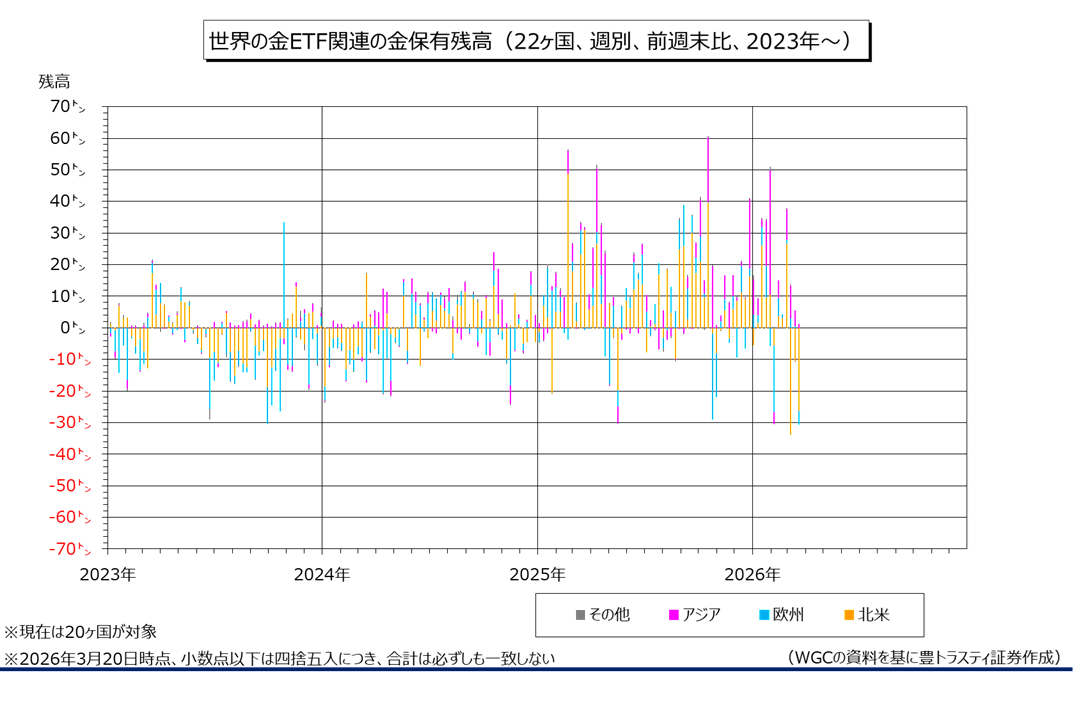 世界の金ETF関連の金保有残高(週別、前週末比)