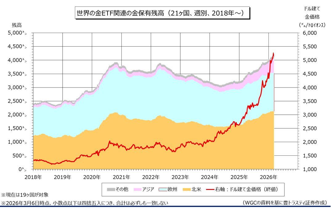 産金業界団体ワールド・ゴールド・カウンシル(WGC)のデータによると、3月6日時点で世界の金ETF(上場投資信託)関連(21ヶ国、現在は19ヶ国)の金保有残高は前週末比20.10トン減少の4139.00トンと、4週ぶりに減少に転じました。