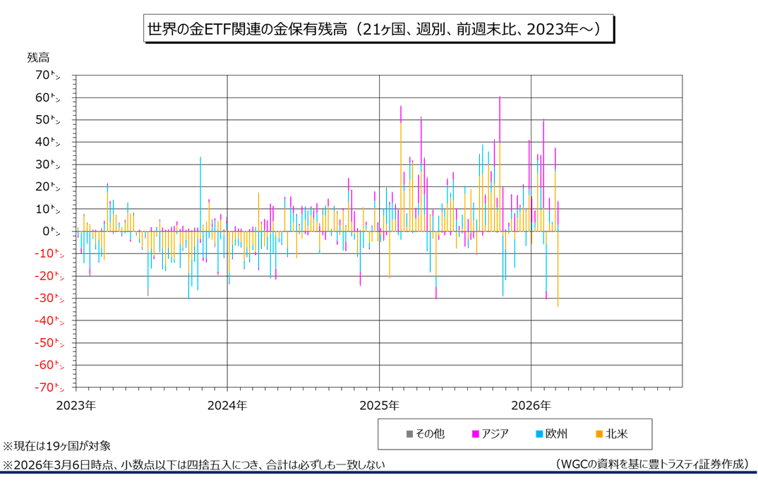 世界の金ETF関連の金保有残高(週別、前週末比)