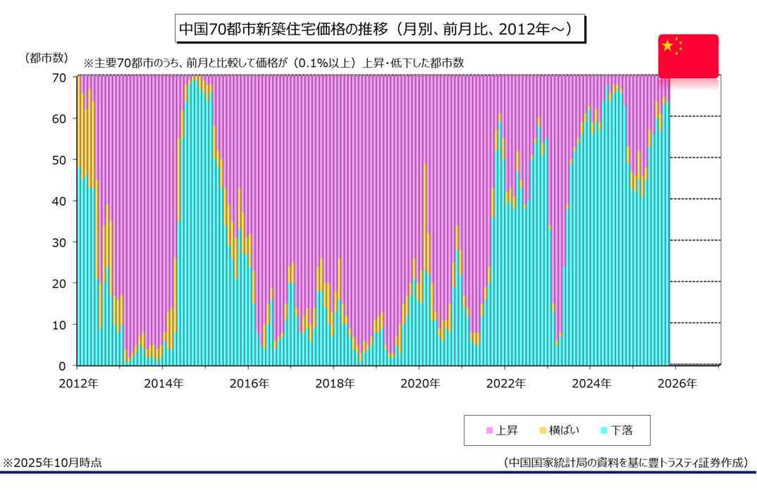 なお、2025年1-10月期中国不動産販売額は前年同期比14.7%減(2025年1-9月期は13.9%減)、新築販売面積は同6.8%減(2025年1-9月期は5.5%減)となっております。