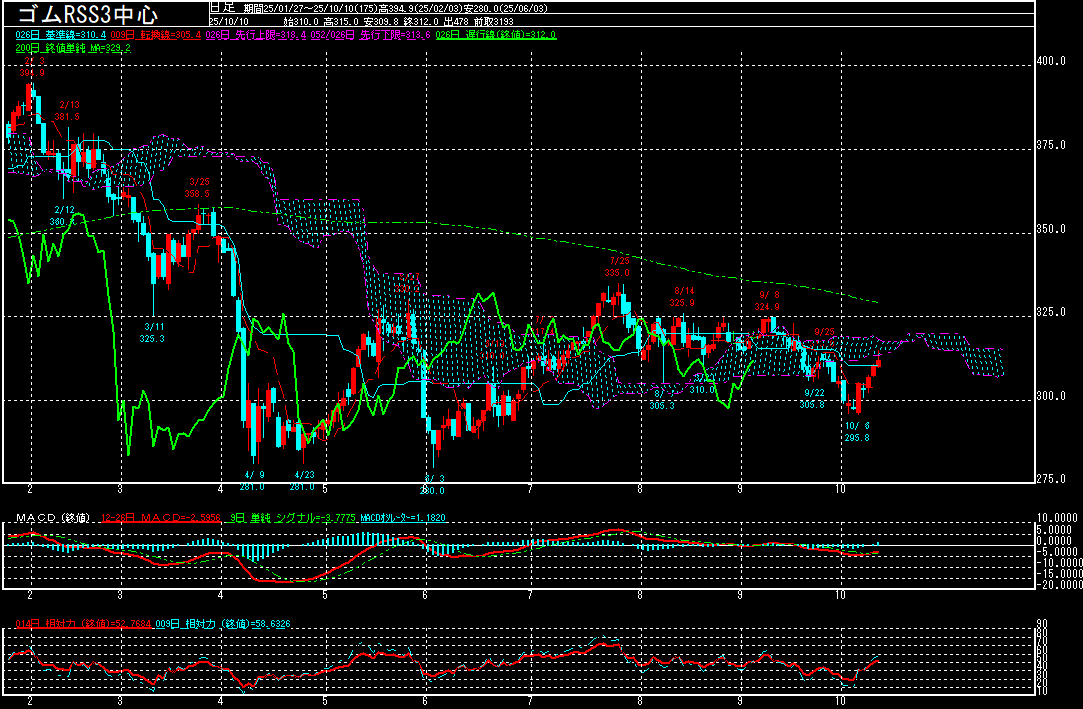 ゴムRSS3(中心限月)は、10月2日に終値では6月25日以来の300円割れとなり、6日に295.8円まで下げる場面もみられております。ただ、相対力指数(RSI)が節目の30%を割り込み、突っ込み売り警戒感が強まる中、売り方のショート・カバー(買戻し)を中心に買い拾われて反発。3営業日ぶりに300円台を回復しました。