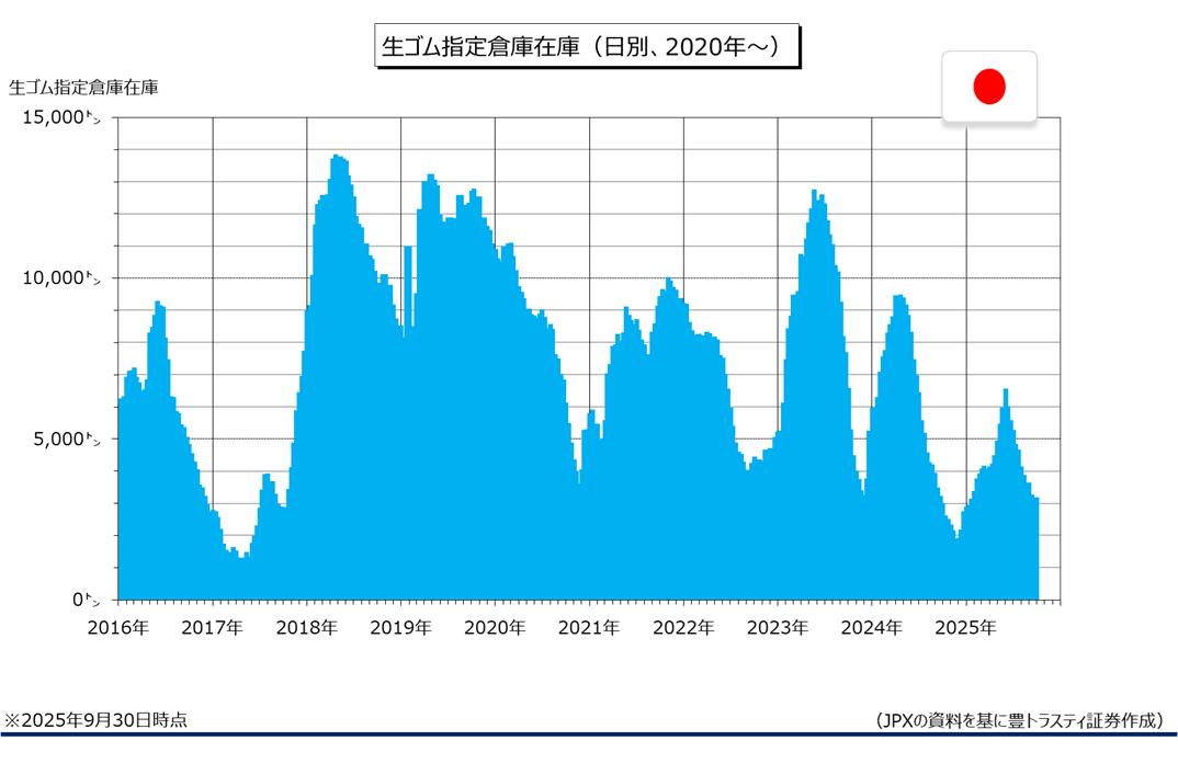 最後に、JPXが集計した9月30日時点の生ゴム(RSS)市場指定倉庫在庫は3114トンで、9月20日時点(3015トン)に比べて99トン増加(入庫は452トン、出庫は353トン、前年同時期の在庫は2922トン)。3旬ぶりに増加に転じました。