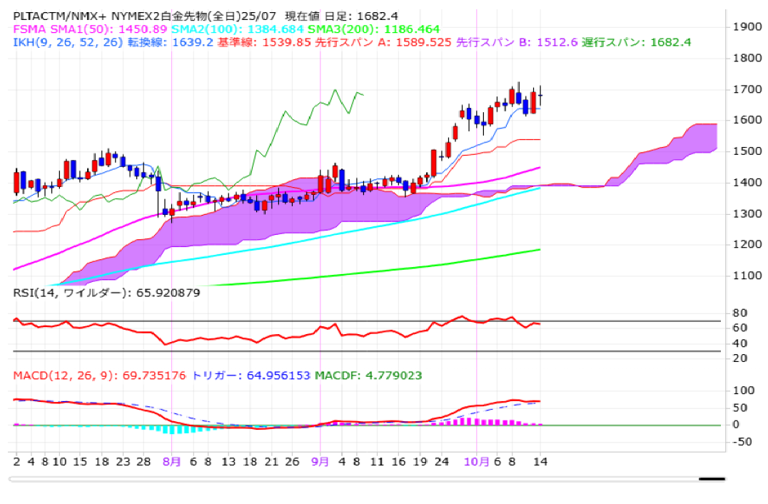 割り込む様ですと、短期的に9月17日の安値1354.0ドルから10月9日の高値1725.7ドルの上げ幅をフィボナッチ・リトレースメントで見た場合の38.2%押し水準1583.7ドル辺りまで下げて来ることも想定されます。ただ、需給のひっ迫感が意識される中、安値は買い拾われそうです。