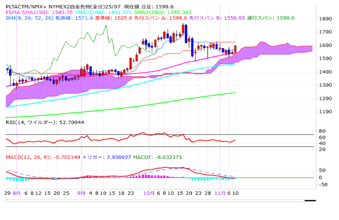 50日平均線や一目均衡表の雲がサポート・ラインとして意識されて、節目の1500ドルを維持する中、このままMACDが下げ止まりの動きを見せ始めるようですと、10月30日以来の1600ドル台を回復する可能性もありそうです。