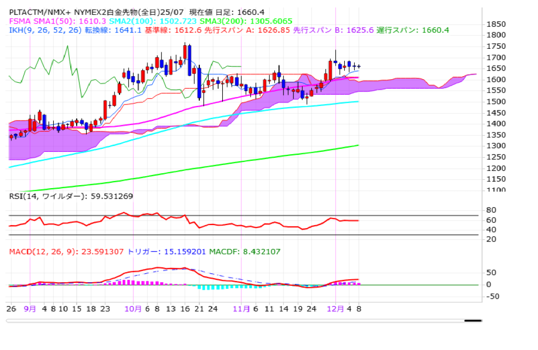FRB高官からハト派な発言が相次ぎ、FRBの追加利下げ観測が再度強まる中、11月21日から28日まで5営業日続伸。12月1日に一時1736.0ドルまで上昇し、10月17日以来の1700ドル台に乗せる場面も見られるも、急ピッチな上昇に対する警戒感が強まる中、6営業日ぶりに反落となりました。