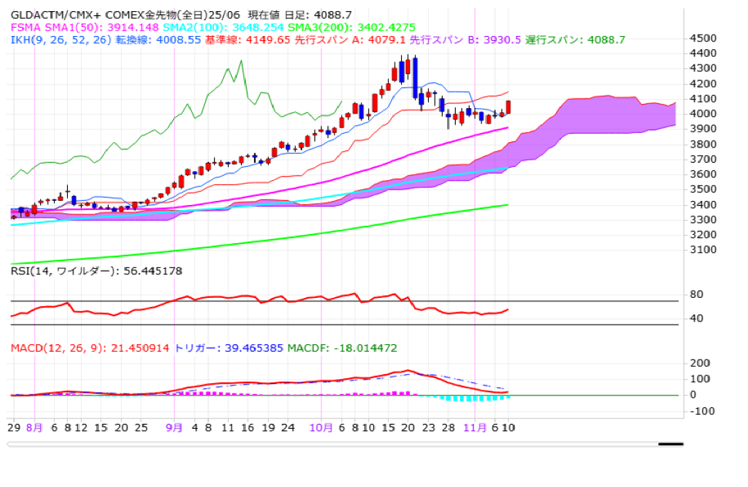 テクニカル的にMACDが下げ止まりの動きを見せ始める中、目先は4000ドル付近で値固めしつつ、10月20日の高値4398.0ドルから10月28日の安値3901.3ドルの下げ幅をフィボナッチ・リトレースメントで見た場合の半値戻し水準4149.7ドルを上抜くようですと、10月24日以来の4100ドル台を回復することも想定されます。
