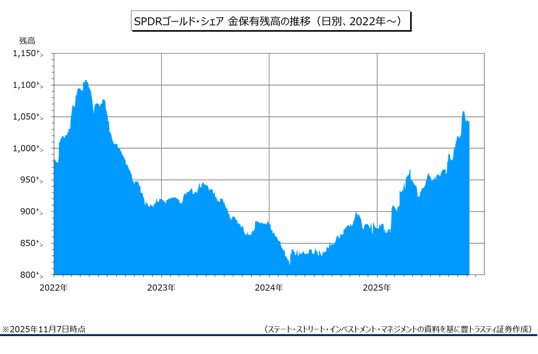 最後に、世界最大の金ETFである「SPDRゴールド・シェア」の金保有残高は11月7日時点で前週末比2.86トン増加の1042.06トンと、3週ぶりに増加に転じました。