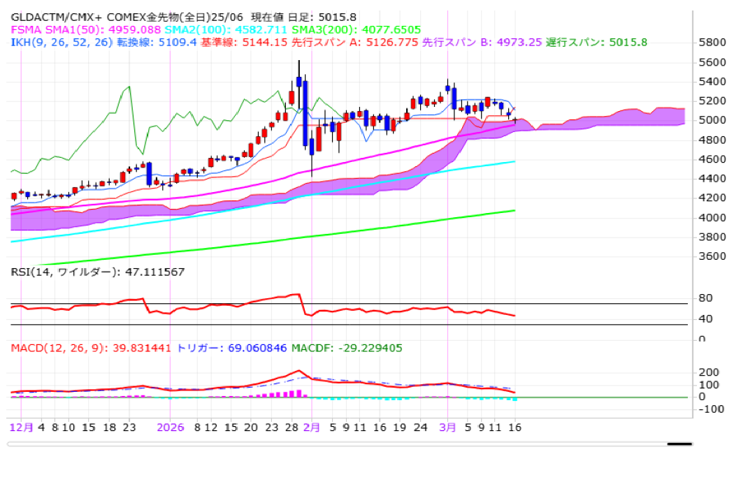 ハメネイ師の後継に同師の次男反米強硬路線とみられているモジタバ・ハメネイ師が選出されたことを受けて、米国とイスラエルによるイラン攻撃が長期化するとの見方から「有事のドル買い」の動きが拡大。相対的にドル建て商品に割高感が生じる中、週明け3月9日に5021.2ドルまで下げる場面も見られております。