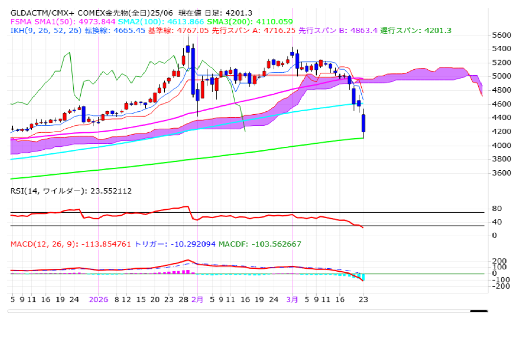 節目の5000ドルを割り込む中、50日平均線や一目均衡表の雲を維持出来なかったことから、19日も大幅続落。100日平均線をサポートに、節目の4500ドル辺りで下げ止まる気配を見せたものの、週明け23日の時間外取引で再び急落。直近安値4423.2ドル(2月2日)を下回り、一時4100.0ドルまで下げる場面も見られております。