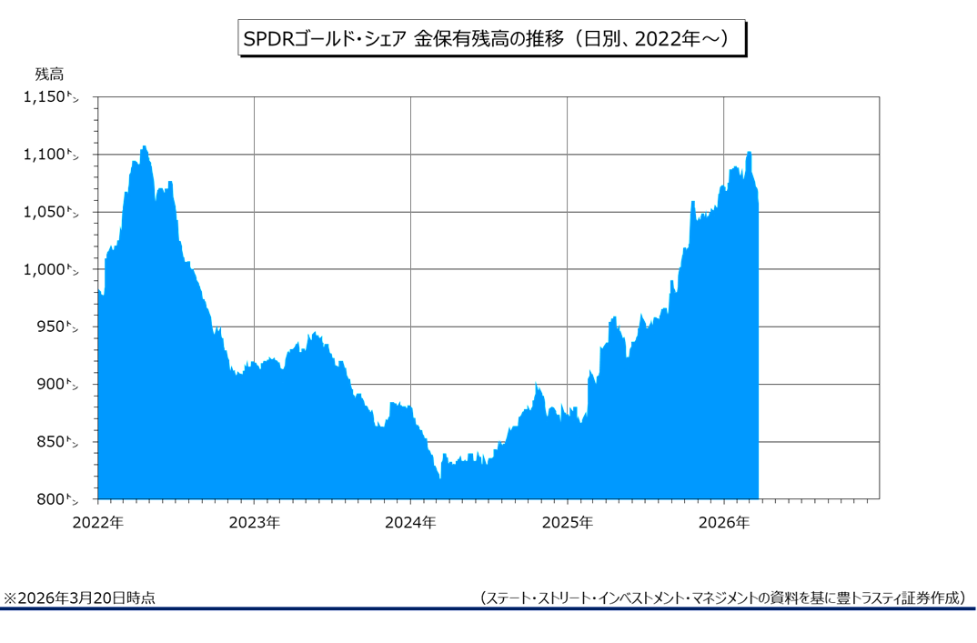 また、米国とイスラエルとイランの軍事衝突は4週目に入りましたが、トランプ米政権から戦争終結に向けた明確な出口戦略が見えない一方で、イランは徹底抗戦の構えを崩していないことから、米国の中東での軍事作戦が市場の想定よりも長期化するとの見方が拡がっております。中東情勢や世界景気の先行き不透明感が高まる中、従来であれば「安全資産」として金が選好されそうですが、「有事のドル買い」の動きは依然強く、ドル建て商品に相対的な割高感が意識されている上に、米長期金利の上昇が続いているため、当面は上値の重い展開が続きそうです。金ETFからの投機資金の流出も続いております。