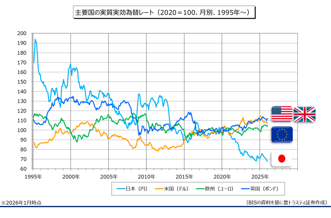 国際決済銀行(BIS)が毎月発表している円の通貨の総合的な価値を示す実質実効為替レート(2020年=100)を見てみると、1月は67.73と、9ヶ月連続で低下。前月(68.26)を下回り、1973年の変動相場制移行後で最も低水準となっております。