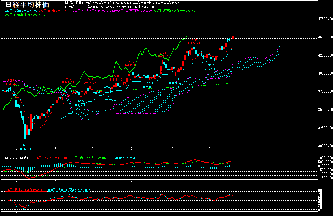 日経平均株価は前営業日比513.05円高の45303.43円で終了となり、反発。終値で、初めて45000円台に乗せております。FOMC(米連邦公開市場委員会)で、FRBは昨年12月以来9ヶ月ぶりに利下げを再開することを決定。また、FOMC参加者の金利見通しで、年内あと2回の利下げが想定されていることが明らかとなりました。今後の利下げが米景気を下支えするとの見方から、昨晩の米国市場でダウ工業株30種平均が最高値を更新したことが好感されて、半導体関連株を中心に買われたようです。9月16日の高値45055.38円を上抜いて、一時45508.67円まで上昇するなど、最高値を更新しております。