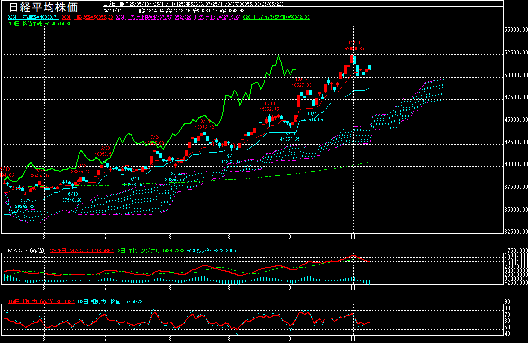 テクニカル的にMACDがデッド・クロスを維持する中で上値の重い展開が続きそうですが、高市新政権の政策期待から日本株の先高観が根強い中、引き続き安値は買い拾われそうです。引き続き51000円を回復出来るか注目されます。