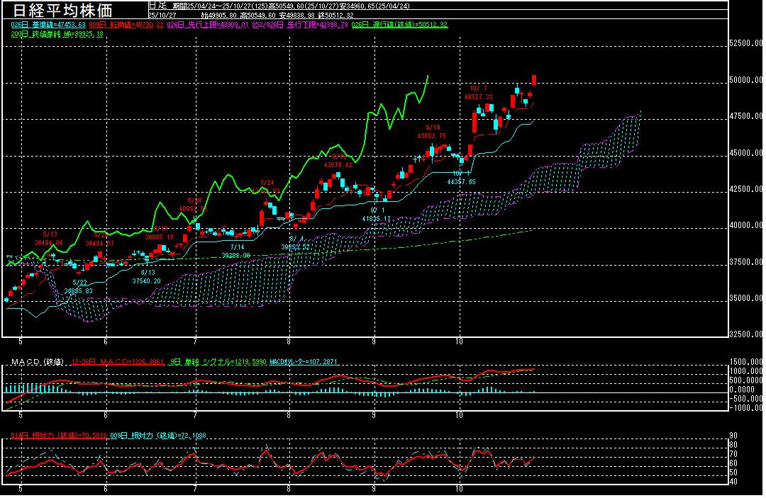日経平均株価は前営業日比1212.67円高の50512.32円で終了となり、大幅続伸。高市新内閣が高支持率での船出となったことを受けて、政治の安定による経済政策の期待が強まったことに加えて、米中貿易摩擦への過度な懸念が後退する中、投資家のリスク選好姿勢が強まったようです。ソフトバンクグループを中心にAIや半導体関連株を中心に買い進められ、一時50549.60円まで上昇する場面もみられるなど、史上初めて50000円台に乗せております。