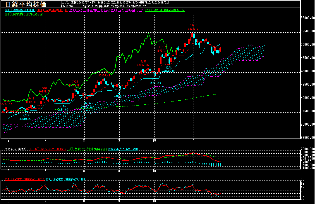 50000円付近では、戻り待ちの売りが出易いとの見方が多いようですが、テクニカル的にMACDが下げ止まりの動きを見せ始める中、25日平均線を上抜いて、17日以来の50000円台を回復出来るか注目されます。