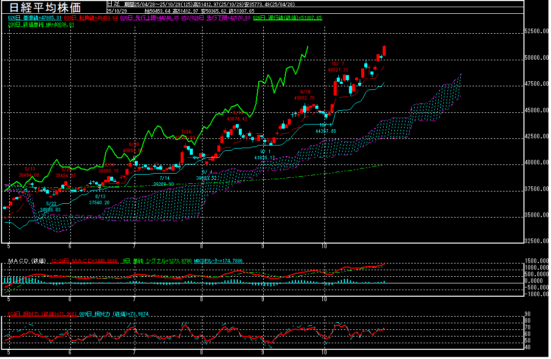 日経平均株価は前営業日比1088.47円高の51307.65円で終了となり、急反発。昨晩の米国市場で主要3指数が揃って最高値を更新したことに加えて、アドバンテスの好決算を受けて、AIや半導体関連株を中心に買い進められたようです。27日の高値50549.60円を上抜いて、一時51412.97円まで上昇するなど、最高値を更新。初めて51000円台に乗せております。
