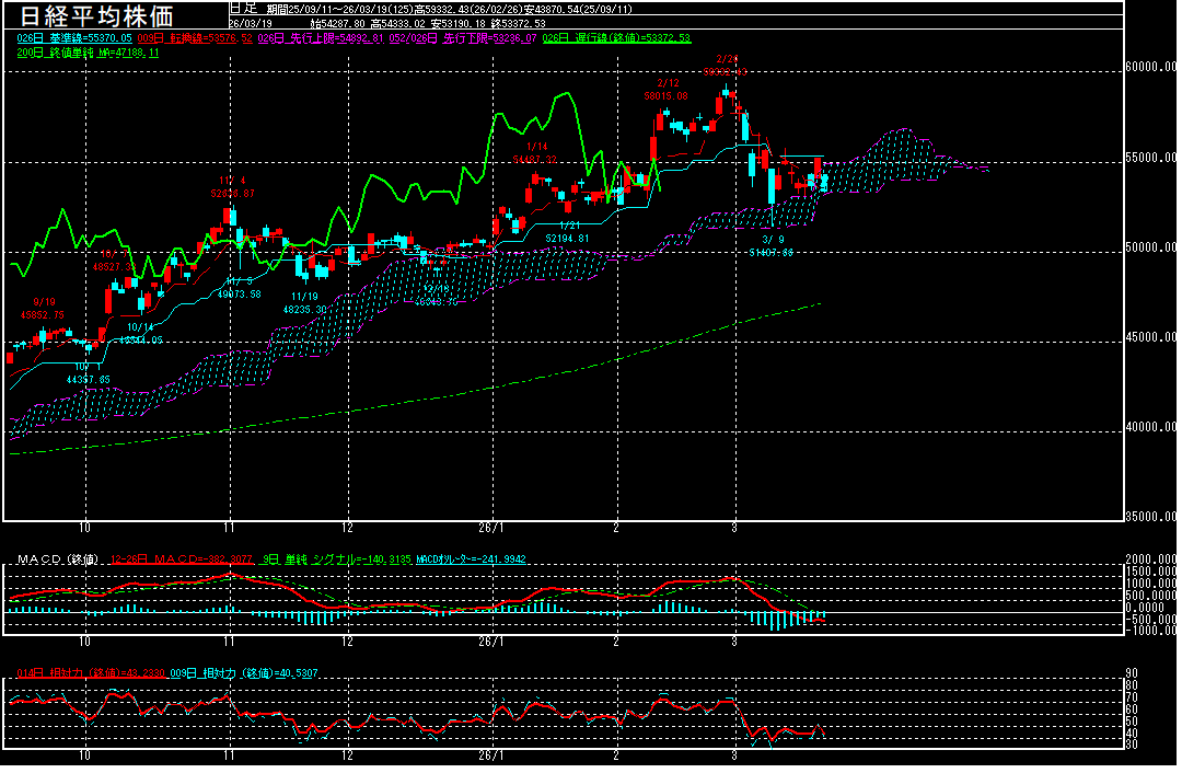 イラン情勢を見極めながら、ボラティリティの高い動きが当面続きそうです。引き続き75日平均線や一目均衡表の雲の下限を維持出来るか注目されます。下抜けるようですと、直近安値51407.66円割れを試すことも想定されますが、高市首相による政策期待から安値は買い拾われそうです。