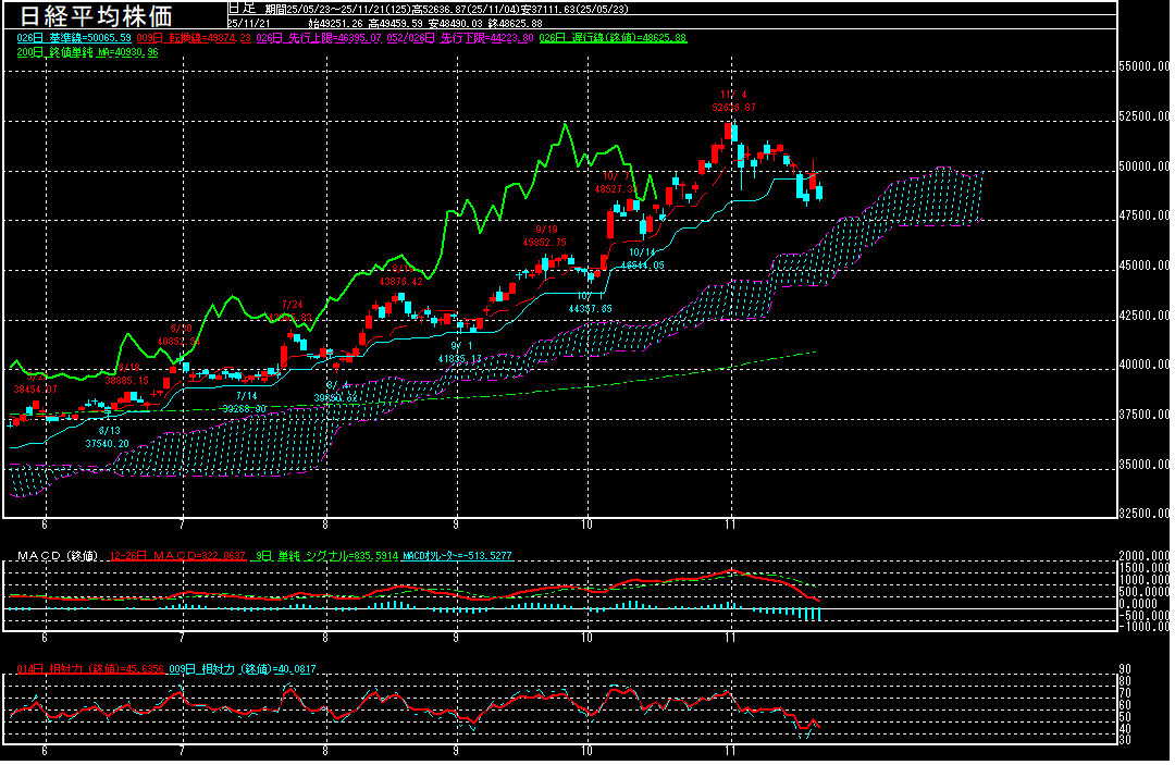 日経平均株価は前営業日比1198.06円安の48625.88円で終了となり、反落。昨晩の米国市場でハイテク株安となったことを受けて、人工知能(AI)や半導体関連株を売る動きが強まったようです。48490.03円まで下げる場面もみられたものの、19日の安値48235.30円は維持しております。
