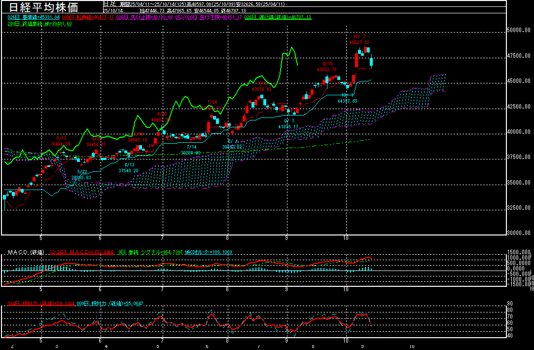 次期政権の枠組みを巡る不透明感が強まる中、ここまで上昇を牽引してきた海外投資家の買いが鈍化するとの見方が出ております。10月1日の安値44357.65円から10月9日の高値48597.08円の上げ幅をフィボナッチ・リトレースメントで見た場合の38.2%押し水準46977.62円を割込みつつある中、このまま47000円台に戻せないようですと、半値押し水準46477.37円も維持出来ずに、10月3日と6日の間に空けたギャップ(窓)を埋める動きになることも想定されます。その場合、25日平均線を維持出来るか注目されます。