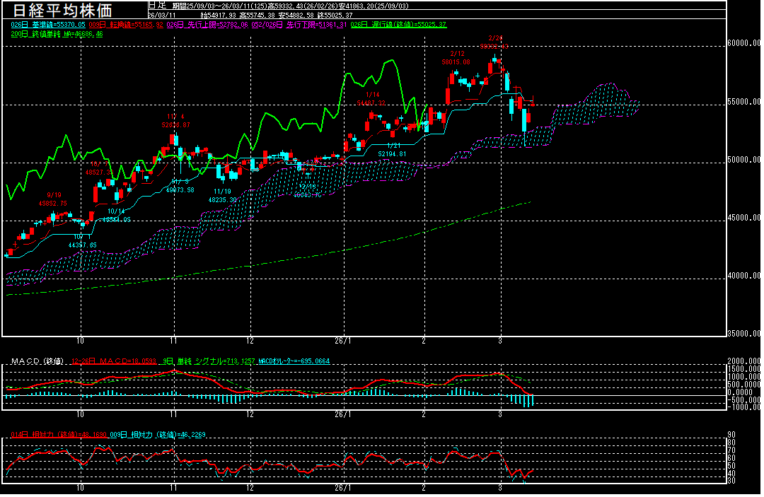 原油価格の上昇が一服する中、引き続き投資家のリスク選好姿勢が続いたようです。米オラクルの好決算を受けて、ソフトバンクグループ(SBG)など、半導体関連株を中心に買い進められる中、55745.38円まで上昇する場面も見られております。ただ、イラン情勢を巡る不透明感が根強い中、高値を維持することは出来ず。